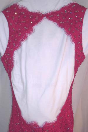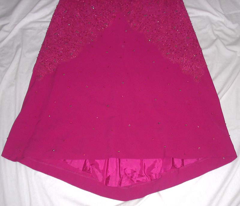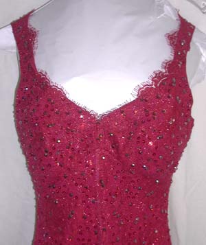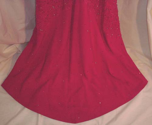 Description: Deep crimson red gown. Austrian Crystal, Rhinestone, sequence & beading over an iridescent lace which opens at the bottom to reveal the fabric underneath.