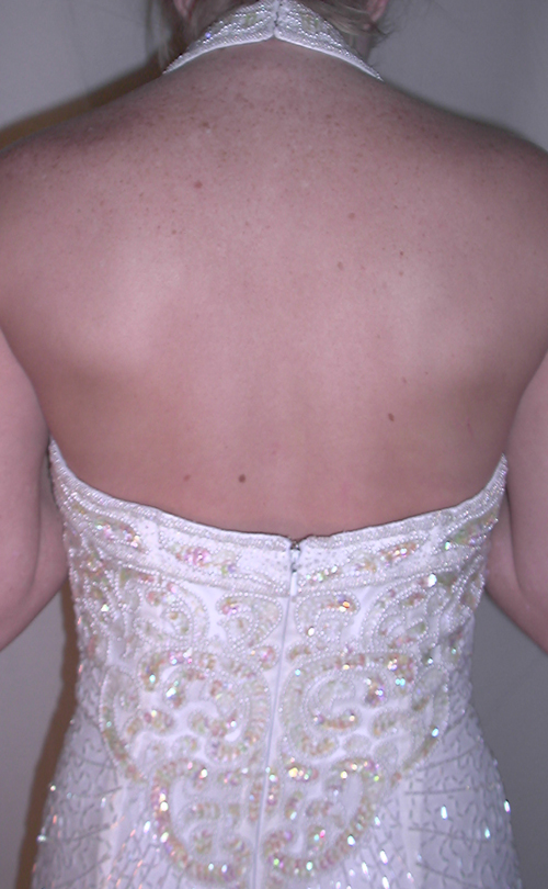 Description: Fully beaded, White silk gown, looks GREAT on stage! Halter bodice is covered with white pearls, irridescent sequence and white liquid beading. Open back . Straight skirt. Padded. Fully lined.