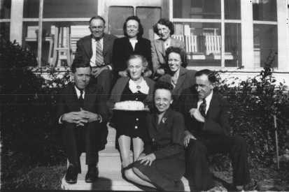 Martha Eugenia (Jennie) Grisham Scroggins on her 80th birthday with 7 of her children, left to right top row, Vance, Emily and Mary, middle row, Buck, Jennie, Geraldine, sitting at Jennie's feet, Alma, Paul--- Jack not pictured. Photo about 1952.